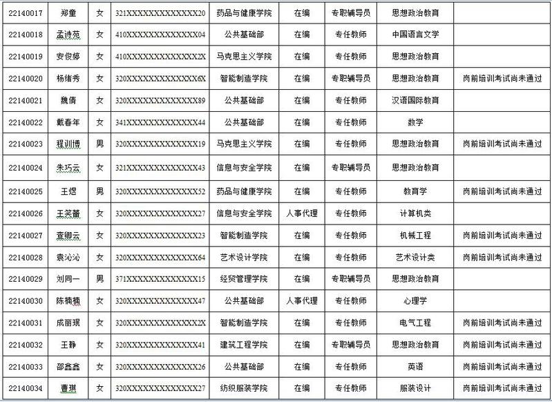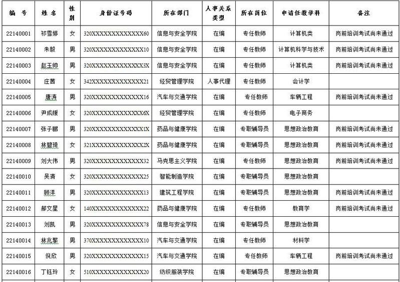 经教育教学能力测试、体检和人事处审核,报学校教师资格审查委员会审查,对2022年高校教师资格申报人员名单现予公示: